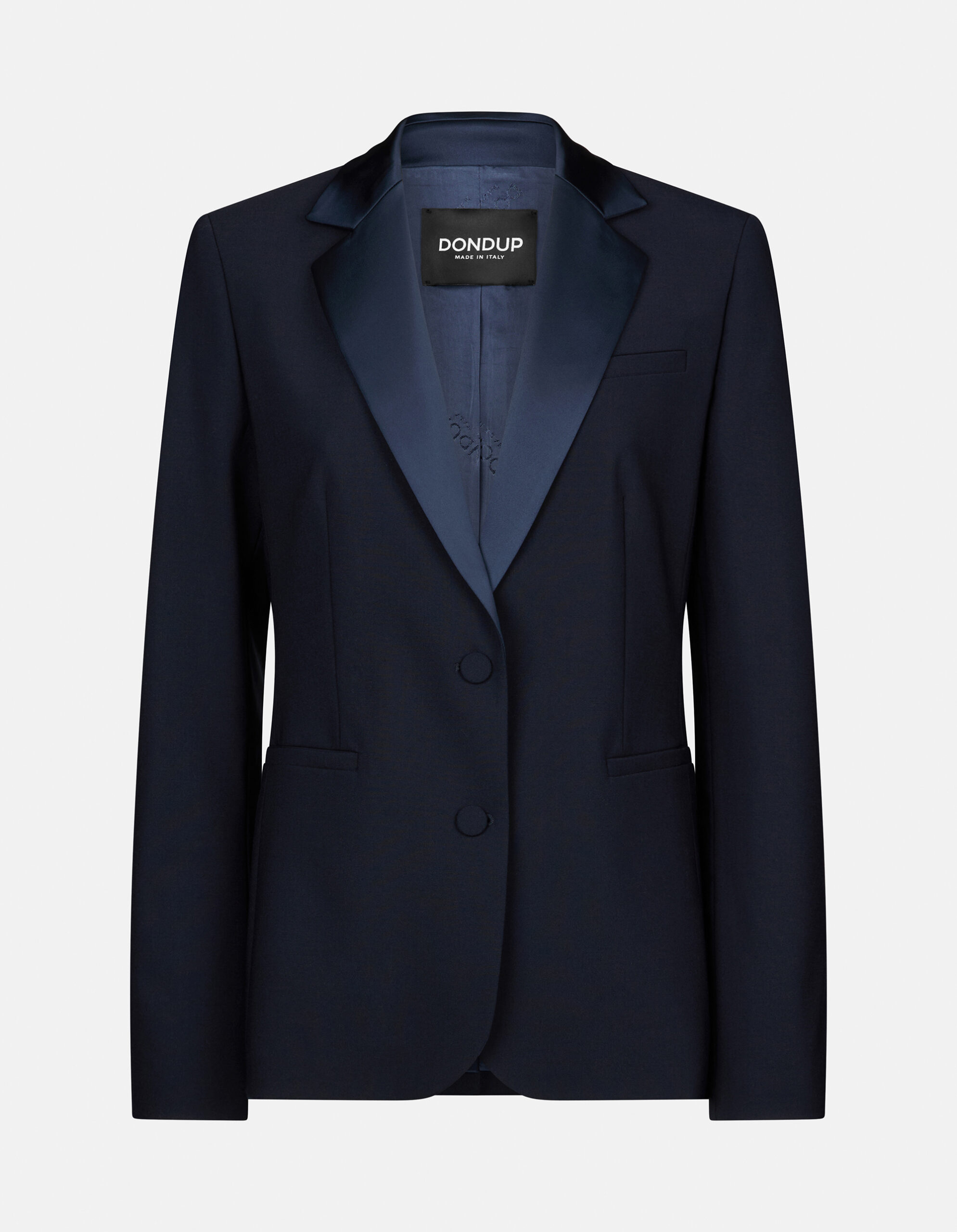 Blazer monopetto slim con chiusura monopetto a due bottoni e il rever in raso aggiungono un tocco sofisticato, mentre le tasche a filetto completano il design con discrezione ed eleganza. Realizzato in tela bistretch con poliestere, lana vergine ed elastan, offre comfort, vestibilità perfetta e resistenza. Il logo Dondup conferisce un dettaglio distintivo.