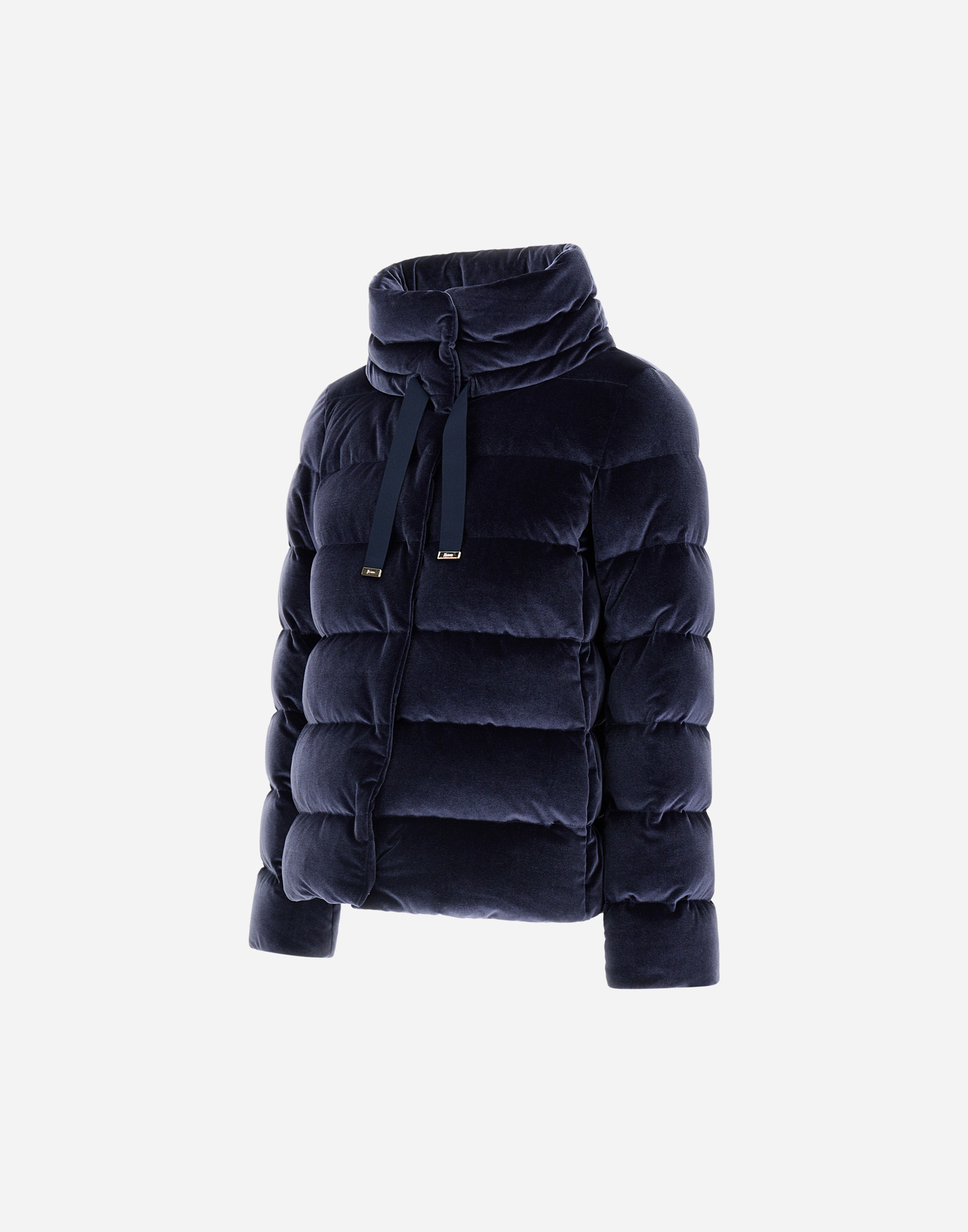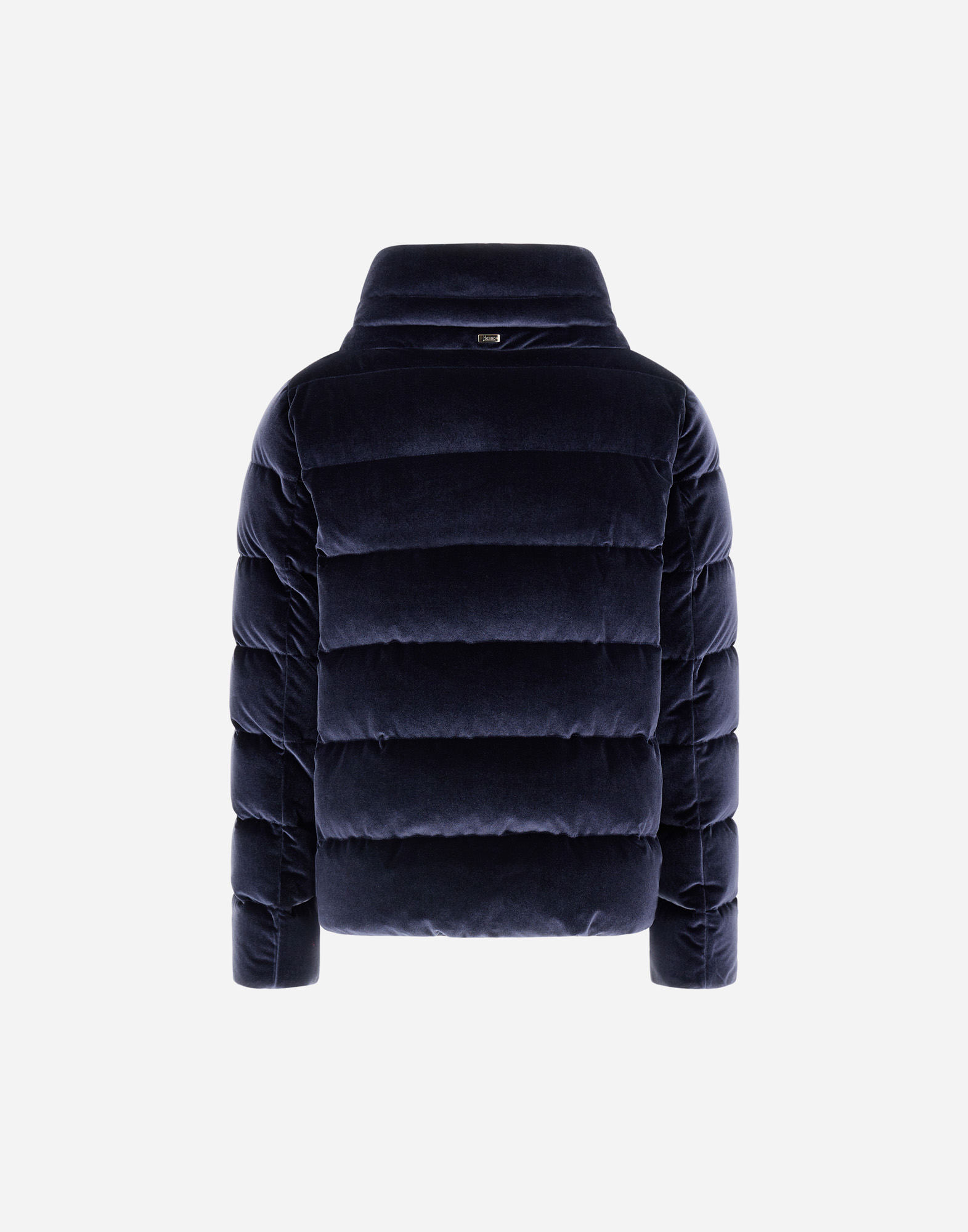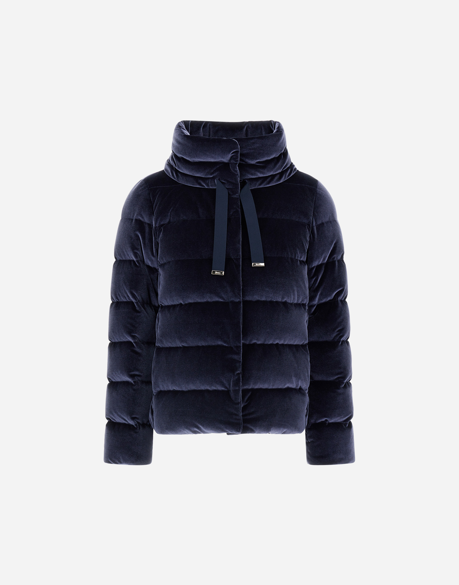 Giacca in velluto liscio indemagliabile, morbido e luminoso, lavorato su telai speciali per ottenere una naturale elasticità. Il design accogliente è rifinito da coulisse sul collo e dalla zip a doppio cursore che permette di modulare la vestibilità.