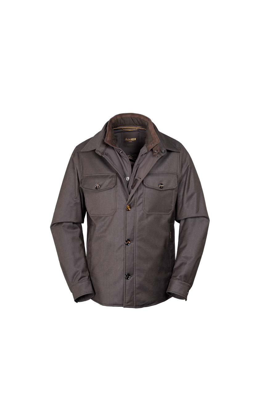Overshirt in flanella di lana vergine mista a cashmere e accoppiata a membrana traspirante e waterproof, è leggera, calda e versatile. La vestibilità regolare, insieme a collo e polsi tipici di una camicia, la rende perfetta da indossare sopra maglie o camicie per outfit casual-chic. Lo stacchino interno removibile con cappuccio offre praticità, mentre la chiusura frontale con bottoni in corno e le tasche a toppa sul petto e laterali con bottoni completano il design con dettagli raffinati. Ideale per look eleganti ma funzionali, perfetta per affrontare giornate fresche con stile.